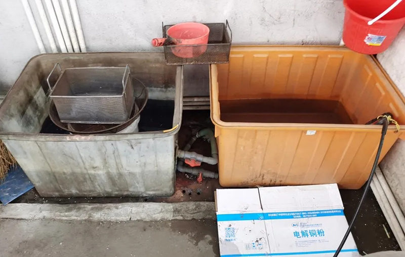 當天中午,樂清市生態環境保護綜合行政執法一隊3名執法人員在柳市鎮長道坦村進行沿河工業企業巡查時,發現一家沿河企業雖然工人已下班,但車間里擺放著各種切割、清洗機器,還有一桶用于拋光產品的光亮劑,懷疑存在污染環境的可能。現場,執法人員發現拋光廢水經銅粉回收槽沉淀后,通過軟管排入企業內污水井,之后再排入排污管網。執法人員對企業內污水井和銅粉回收槽廢水進行取樣,經樂清市環境監測站監測,污水井內的水樣中重金屬銅含量為210mg/L,超過《污水綜合排放標準》(GB8978-1996)表4(三級)標準限值十倍以上。