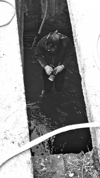 在廠區(qū)內(nèi),環(huán)保人員撬開一塊松動的蓋板。隨后,專業(yè)的蛙人佩戴好呼吸器、氧氣瓶,帶上強光手電進入暗涵。蛙人經(jīng)過近20米的仔細(xì)排查后,終于在暗涵內(nèi)發(fā)現(xiàn)有一根直徑約15厘米的PVC管道,管口呈紅色。