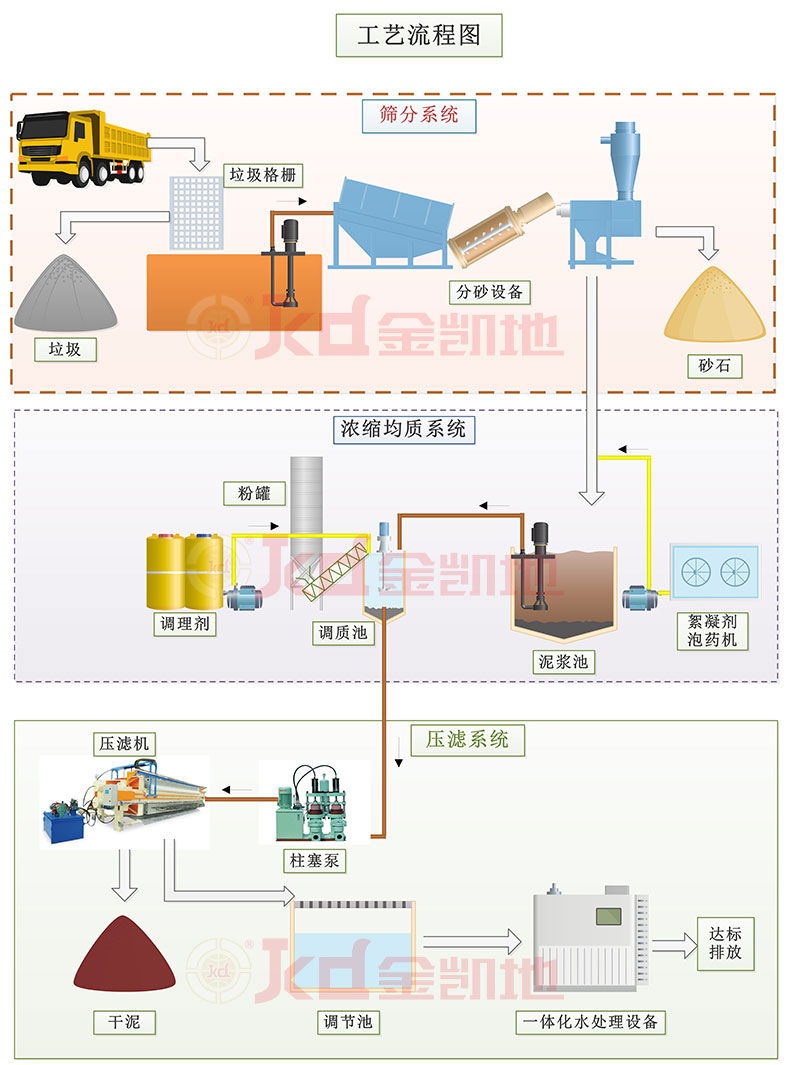 針對河道污泥特點,工藝方案需以泥樣分析實驗為基礎,設計一系列的流程解決相關問題。同時方案也和河道清淤方式相關,如采用絞吸船清淤,則污泥含水率較大,需比較大的泥漿池儲存和濃縮污泥。如采用挖掘機清淤,則污泥含水率小,但含有的垃圾砂石較多,需采用對應的分離清楚設備和工藝。以下為金凱地壓濾機廠家設計的常規處理工藝: