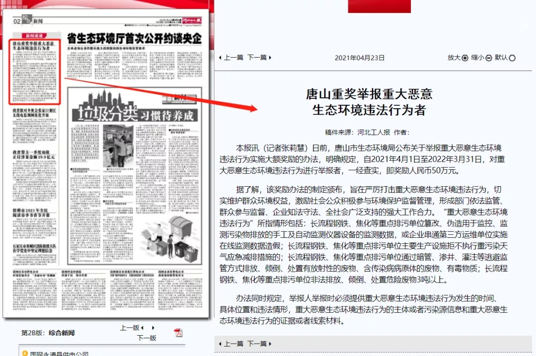 日前,唐山市生態(tài)環(huán)境局公布關(guān)于舉報(bào)重大惡意生態(tài)環(huán)境違法行為實(shí)施大額獎(jiǎng)勵(lì)的辦法,明確規(guī)定,自2021年4月1日至2022年3月31日,對(duì)重大惡意生態(tài)環(huán)境違法行為進(jìn)行舉報(bào)者,一經(jīng)查實(shí),即獎(jiǎng)勵(lì)人民幣50萬(wàn)元。