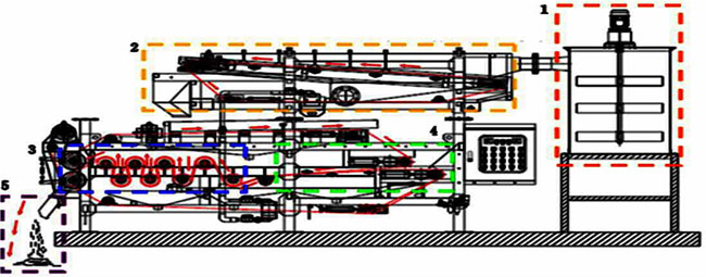 1-化學預處理脫水段;2-重力濃縮脫水段;3-楔形區預壓脫水段;4-擠壓輥高壓脫水段;5-物料排出段