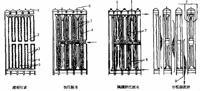 注:1-濾布結合處;2-濾框(板框腔);3-濾液通道;4-濾布;5-濾板;6-擠壓進氣管;7-隔膜;8-壓縮空氣室;9-泥餅.