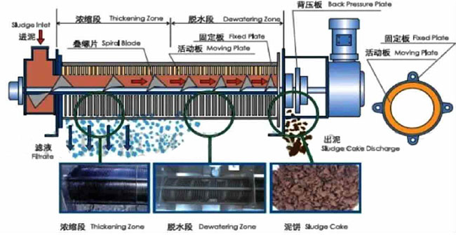 (4)脫水:疊螺主體內的螺旋軸的螺距逐漸變小,環與環之間的空隙也逐漸變小,在排出口的背壓板的作用下,脫水部內產生極大的內壓,使礬花在脫水部充分脫水。