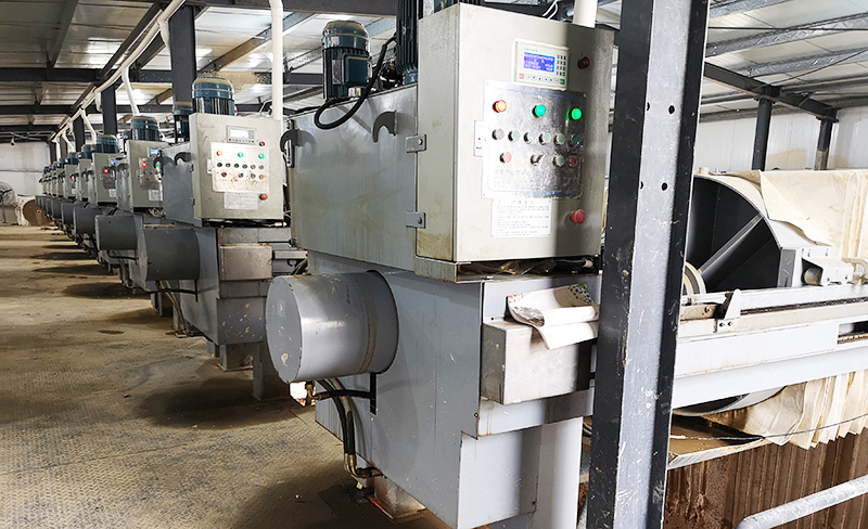 翻轉下來的污泥進入超長的楔形預壓脫水區將重力區卸下的污泥緩緩夾住,形成三明治式的夾角層,對其進行順序緩慢預增加壓過濾,使泥層中的殘余游離水份減至最低,隨著上下兩條濾帶緩慢前進,兩條濾帶之間的上下距離逐漸減小,中間的泥層逐漸變硬,通過預壓脫水大直徑的過濾輥, 將大量的游離水脫掉,為泥餅順利進入擠壓脫水區,進入“ S ”壓榨段,在“ S ”型壓榨段中,污泥被夾在上、下兩層濾布中間,經若干個壓榨輥反復壓榨,上下兩條濾帶在經過交錯各輥形成的波形路徑時, 由于兩條濾帶的上下位置順序交替,對夾持的泥餅產生剪切力, 將殘存于污泥中的水分絕大部分積壓濾除,促使泥餅再一次脫水,最后通過纖維刮板將干泥餅刮落,由皮帶輸送機或無軸螺旋輸送機運至污泥存放處。