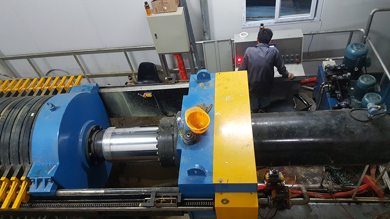 程控自動(dòng)高壓隔膜壓濾機(jī)主要由框架部分,過(guò)濾部分,濾板移動(dòng)機(jī)構(gòu),加壓部分,排出機(jī)構(gòu),液壓系統(tǒng)和電子控制系統(tǒng)組成。 框架主要由主梁,固定壓板,后支架和輔助支撐部分組成。過(guò)濾器部分由壓濾板組件和交替布置在主梁上的過(guò)濾器濾板組件組成,兩個(gè)濾板的兩側(cè)覆蓋有過(guò)濾器。 濾板移動(dòng)機(jī)構(gòu)主要由液壓馬達(dá)和驅(qū)動(dòng)鏈組成。壓緊部分由活動(dòng)油缸座和滑塊組件組成。排料機(jī)構(gòu)由兩個(gè)振動(dòng)油缸和一個(gè)擺錘組成,擺錘固定在由桿組成的濾板上。液壓系統(tǒng)包括油泵,液壓控制元件,液壓執(zhí)行器,高位油箱等;電子控制系統(tǒng)由電控柜,壓濾機(jī)的機(jī)械行程開(kāi)關(guān),液壓站的油泵電機(jī),電磁閥和泥漿壓縮空氣管路電控閥組成。